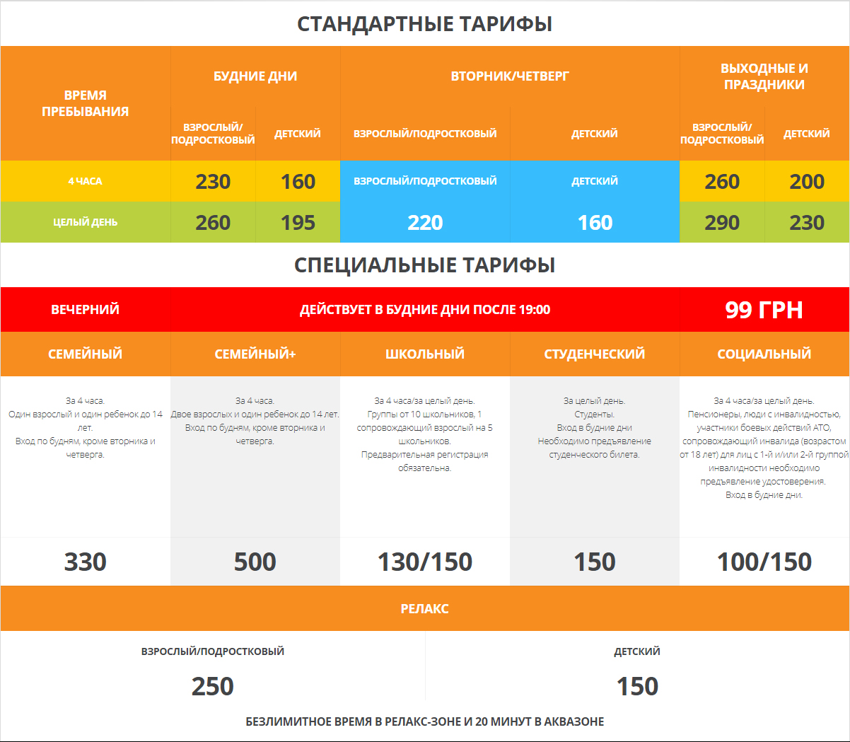 Взрослые: Пн-Пт - 195 грн., Выходные и праздники 220 грн.;